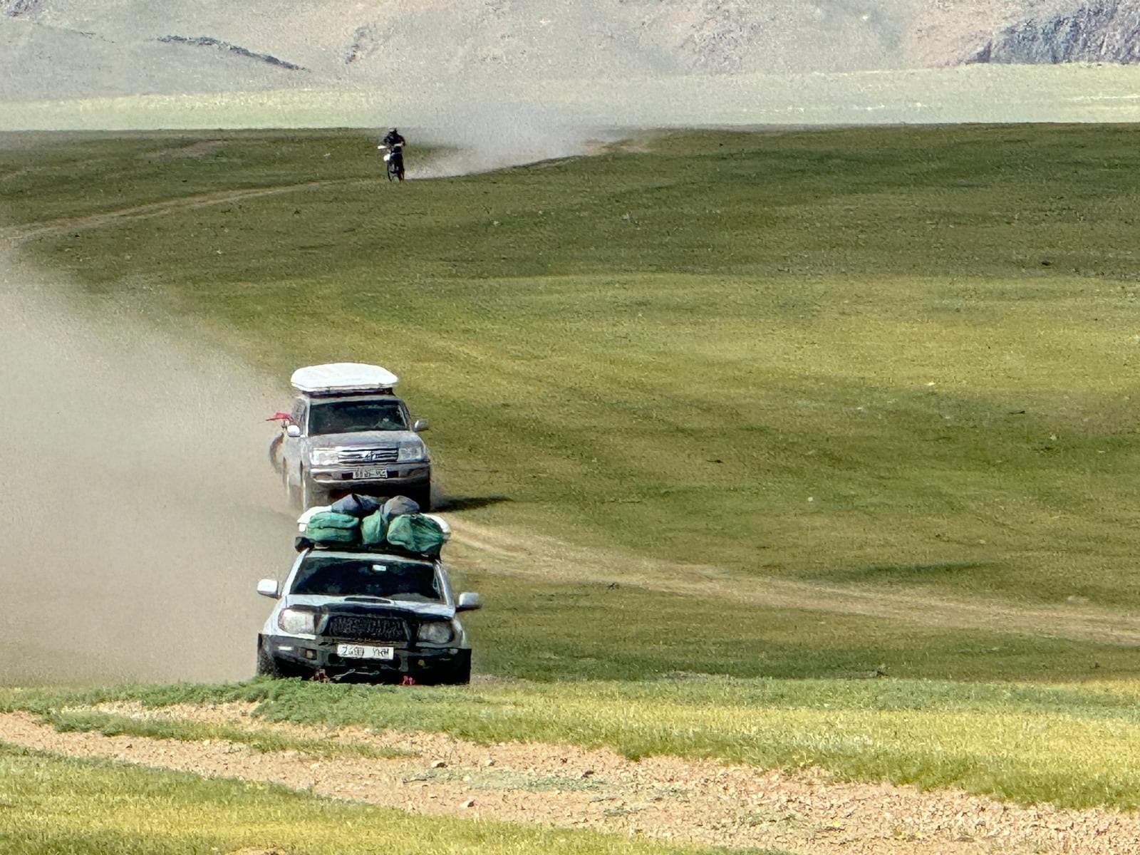 Wir übernehmen die Motorräder und Jeeps und starten unser Abenteuer in Richtung Westen. Auf den ersten 100km auf Asphalt gewöhnen wir uns an unsere fahrbaren Gefährten. Danach beginnt der Offroad Spass und wir fahren durch schöne Täler bis Burekhangai. Gemeinsam mit unseren mongolischen Begleitern bauen wir das Nachtlager auf und geniessen anschliessend kühle Getränke und Essen am Lagerfeuer. Der Sternenhimmel lässt uns von unendlicher Freiheit träumen. Wir sind in den Weiten der Mongolei angekommen.